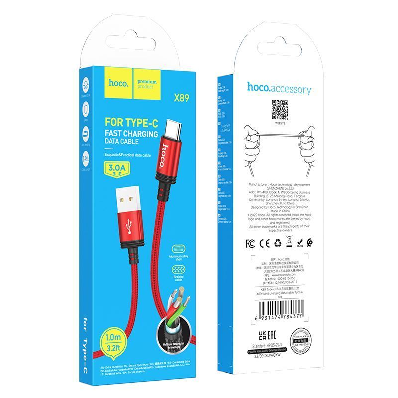 Дата-кабель Hoco X89 Type-C (нейлон 1м., 3A) цвет: красный